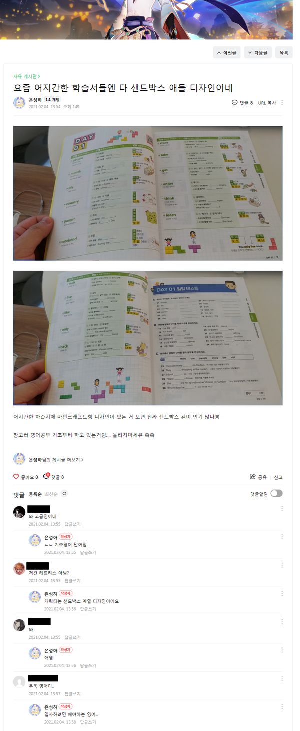 | ¶Ç ¿ø½ÅÄ«Æä¼ ÀÔ Åаí Àִµ¥, º¸´Ï±î ¹º ¸»ÀÎÁö ¸ð¸£°Ú½À´Ï´Ù. ÇнÀ¼µéÀÌ »÷µå¹Ú½º ¾Öµé µðÀÚÀÎÀ̳×, Çϴµ¥ ¹º ¸»ÀÌÁö? ½ÍÀ½. »÷µå¹Ú½º ¼Ò¼Ó Å©¸®¿¡ÀÌÅ͵é ij¸¯ÅÍ µðÀÚÀÎÀ̶ó´Â°Ç°¡? Çߴµ¥. ±Û º¸¸é ¹º ¸»ÀÎÁö ¸ð¸£°Ú¾î¿ä. ÀÌ »õ³¢ ¸¶ÀÎÅ©µµ ¾È ÇØºÃ³ª. ¾Æ´Ï ¸¶ÀÎÅ© ¹ºÁö ¸ð¸£Áö? ±Ùµ¥ ±Ûµµ °¡°üÀ̳×? '¿µ¾î°øºÎ ±âÃÊ'ºÎÅÍ Çϰí Àִ°ÅÀÓ. |