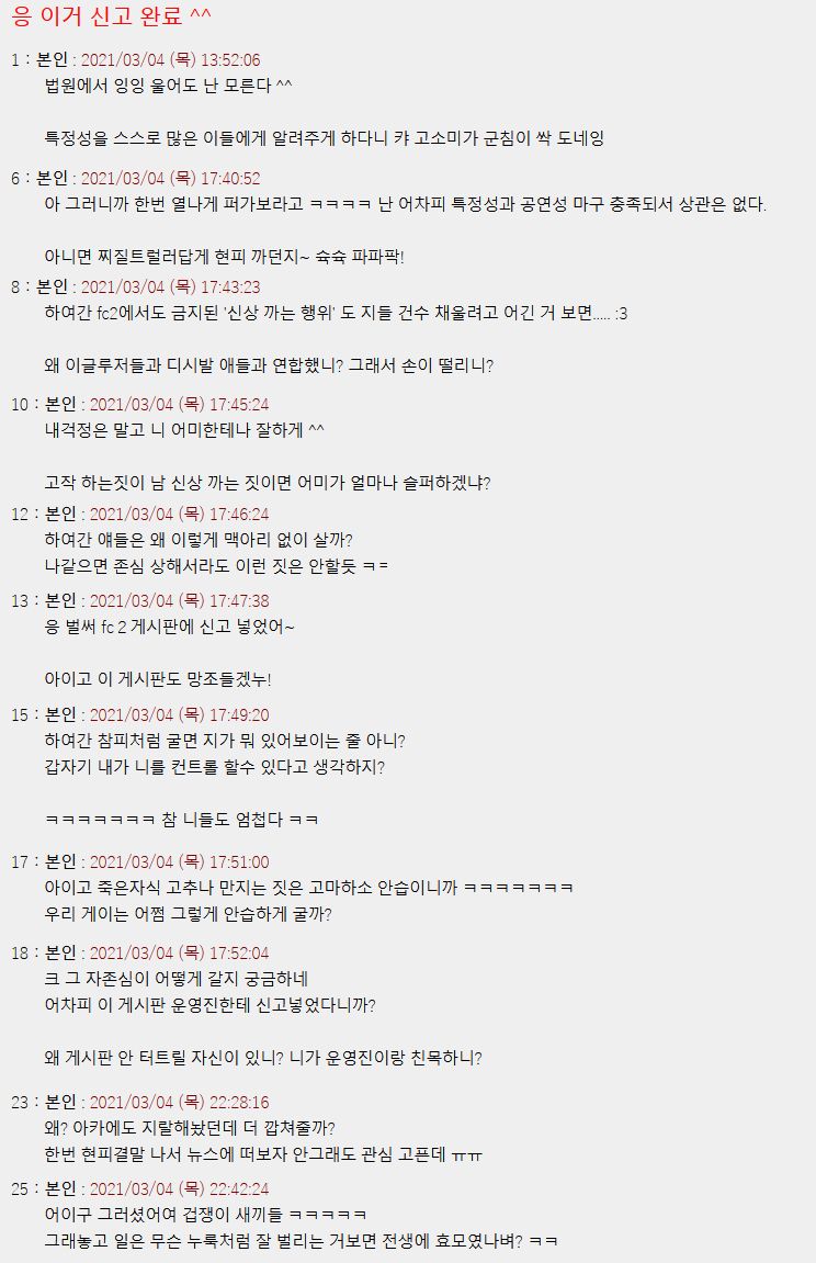 | ´ë° 3¿ù 4ÀÏ 14½Ã °æ ½º·¹µå °³¼³ÇÑ µÚ ÁÁ´Ù°í ³¥³¥ °Å¸®¸é¼ ÆÄÀÌÆÃ ³ÑÄ¡°Ô "¾îµð Çѹø ´ýººÁ¶ó!" ¿ä·¯°í ÀÖ½À´Ï´Ù. 6ÀÏ Âë¿¡ ¾¿¾¿ ´ë°í ¿ï¸é¼ ³ª°¥ °Å »ý°¢µµ ¸ø ÇÏ¸é¼ ¸»ÀÌÁÒ. ÀÏ´Ü ÀÌ°Ô ¿øº»ÀÌ ¾ø¾î¿ä. ÀÌ ´ç½Ã¿£ ³ëÇϿ찡 ÁøÂ¥ ¾ø¾ú¾î¿ä. ¾Ïư ÆÄÀÌÆÃ ÇØ¼ ½º·¹ °³¼³Çؼ ±ÛÀ» Àû±â ½ÃÀÛÇÕ´Ï´Ù. "ÇÏ¿©°£ FC2¿¡¼µµ ±ÝÁöµÈ '½Å»ó ±î´Â ÇàÀ§'µµ Áöµé °Ç¼ö ä¿ï·Á°í ¾î±ä °Å º¸¸é... :3))))" "´Ï ¾î¹Ì¿¡°Ô ÀßÇÏ°Ô ^^" ±×¸®°í ÀÌ ¶§ ¾Æ¸¶ FC2 ¸»°íµµ ¾ÆÄ«¶óÀ̺ê ä³Îµµ ´©±º°¡ 'Á¦º¸'·Î ¾Ë°Ô µÇ¼ "°Ô½ÃÆÇ ½Å°í ³Ö¾ú´Ù" ÀÌ·´´Ï´Ù. |