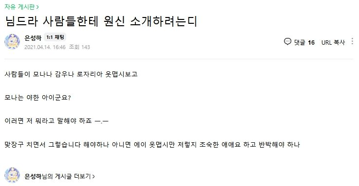 | Áö°¡ °³Áö¶ö ¶³´Ù°¡ ·¯ºê¶óÀÌºê ³×À̹ö ÆÒÄ«Æä¿¡¼ ¦i°Ü³ª ³õ°í¼± Àúµý ¾Ã¼Ò¸± ÇÏ°í °è½Ã³×¿ä. ¶ó½ºÆ®¿À¸®ÁøÀº ¹¹ ³²³à ¼ººñ°¡ 5:5 ÀÎ ÁÙ ¾Æ½Ã³ªºÁ¿ä? ±â¾ïÀ» Ãë»ç¼±Åà ÇÏ°í °è½Ã³×. ¾¾¹ß ·¯ºê¶óÀ̺ê·Î ÀÔ ÅÍ´Ï±î »ý°¢³ª´Â°Çµ¥, Àú »õ³¤ ÀÛǰ¼Ó¿¡ ÀÚ±æ ¾î¶»°Ôµç ³Ö°í½Í¾î¼ ·¯ºê¶óÀ̺꿡 ÇÁ·Îµà¼¸¦ ³Ö´Â µîÀÇ º´½ÅÁþÀ» ÇÔ. ÇÁ·Îµà¼¸é ¾ÆÀ̸¶½ºÀε¥, Àú »õ³¤ Áö ±ñ »ç¶÷µéÀÌ ¾ÆÀ̸¶½º ÁÁ¾ÆÇÏ´Ï±î ·¯ºê¶óÀ̺ê·Î °£°ÅÁö. °Íº¸´Ù ·¯ºê¶óÀ̺꿡µµ ¿©Ä³¸¸ ³ª¿À´Âµ¥ ±×·³ ³²Ä³ ³ª¿À³Ä? À̰Šº´½ÅÀΰ¡. ¸ð¸£°í »¡¸®°¡ ¾øÁö. »ç½Ç»ó ±× ÀÎÅÍ³Ý Æ®Æä¹Ì³âµé Á¸Àß´ÔÀÌ ºü´Ï±î °°ÀÌ ¼±ÅÃÀûÀ¸·Î »¡¾Æ´ëµíÀÌ ±×³É ºü´Â°Å °°À½. ¾Ïư ¾Ã¼Ò¸® °ñ¶ó¼ ÇÏ°í ±¸¶ó Ä¡°í ±â¾ïÀ» Ãë»ç¼±Åà Çϴϱî ÀÌ·± ȨÆäÀÌÁö°¡ ³ª¿À´Â°ÅÀݾƿä! |