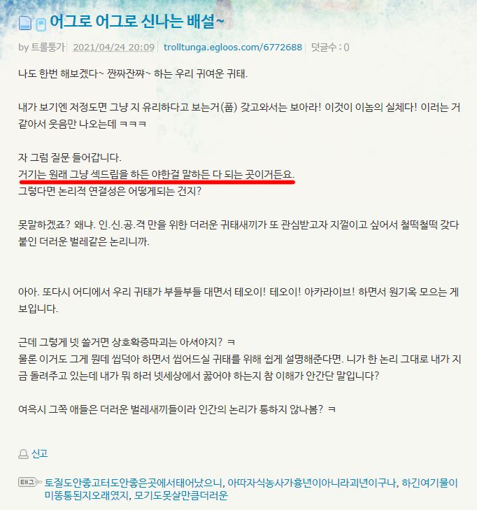 | Á×»§À¸·Î ¾î¸Ó´Ï¸¦ ¶§·Á¼ ¼ûÁö°Ô ¸¸µç ¾Ö¹ÌµÚÁø ³¿»õ³ª´Â Ä¡±¸ ÇÑÁ¾¿ì¾¾´Â ¹º ¾Ã¼Ò¸± Çϴ°¡ º¸¸é. ÀÏ´Ü Àú ÁÙ ÃÄÁø Àú ºÎºÐÀÌ Áß¿äÇÔ. Àú »õ³¤ ÀÏ´Ü À̱۷罺¿¡¼ ¾²´Â ¸»ÀÌ ´Ù ¢´Â¼Ò¸®ÀÓ. ¾Ïư... Àú »õ³¢°¡ Áö±Ý ¸»ÇÏ´Â°Ô ³×À̹ö ¶ó½ºÆ®¿À¸®Áø °ø½Ä Ä«ÆäÀε¥, Àú°Å ±×³É °³ ¾Ã¼Ò¸®ÀÓ. '°Å±â´Â ¿ø·¡ ±×³É ¼½µå¸³À» ÇÏµç ¾ßÇÑ°É ¸»ÇÏµç ´Ù µÇ´Â °÷À̰ŵç¿ä' ¶ó°í Çϴµ¥´©±¸µµ °Å±â¼ ±×·±°Å Çã¿ëÇÑ´Ù°í ¸» ÇÑ Àû ¾øÀ½. ÀÖ°Ú³Ä? ¹ÌÄ£³ðÀ̾ß? ±×·¡¼ Àü¿¡ '¼ºÀÎÁöÇâ Ä«Æä¿¡¼ ÅÐÅÐÇÏ°Ô ¼ºÀΰü·Ã °Ô½Ã±Û'À» ¿Ã¸°°Å¾ß? |