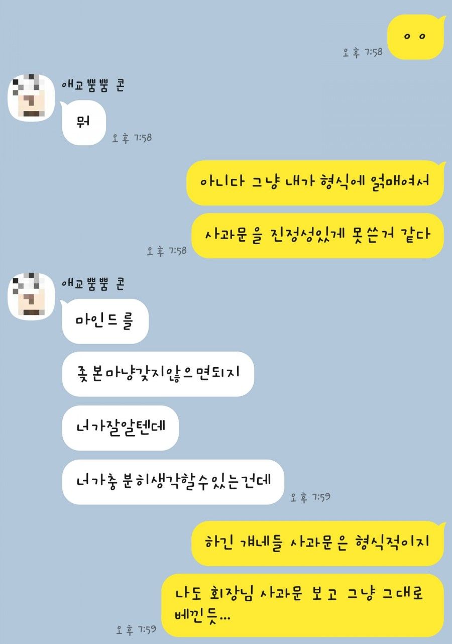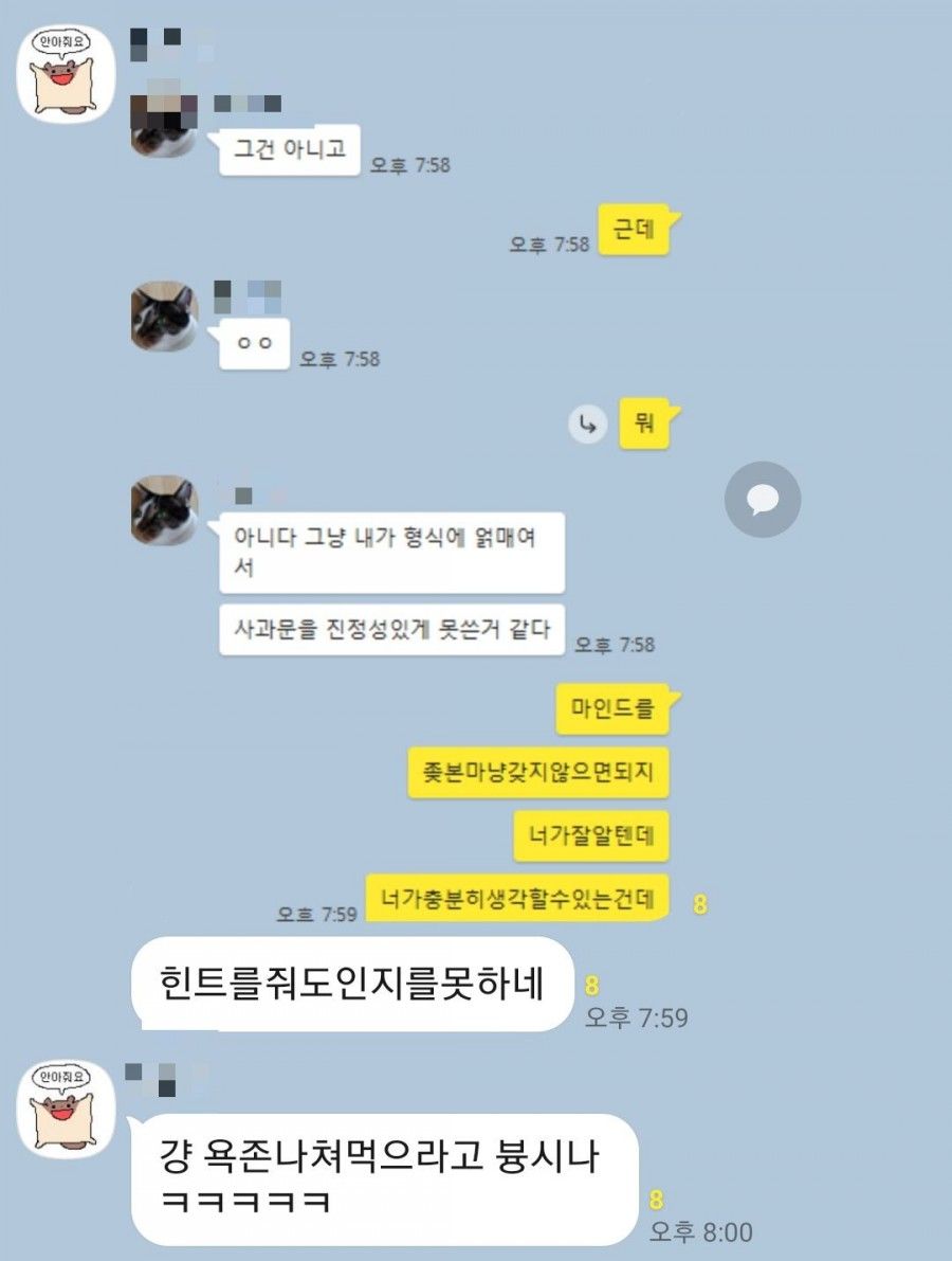 | [ÆÛ°¡ÁÖ¼¼¿ä]³×À̹ö ´Ð ¿¡ÁøÇÎ, Æ®À, ºñ¾îº£¾î µîÀÇ °¡½º¶óÀÌÆÃ°ú µÚÅë¼ö Ä¡±â¸¦ °ø·ÐÈ ÇÕ´Ï´Ù. >> ¾îµð¼ ¶Ç °°ÀÝÀº ´Ü¾î ¹è¿ö¿Ô´Âµ¥ ±×¦¿¡¼ ÀÚÁÖ ¾²´Â ´Ü¾îµéÀ̳×. ¹¹ Ʋ¸°¸»Àº ¾Æ´ÏÀÝÀ½? :3)) >> ±Ùµ¥ À̰ŠīÅ×°í¸®°¡ '°øÁö»çÇ×' ÀÓ. ³î¶ø´Ù. Áö Æ÷½ºÅ¸ÀÔ °øÁö ¿Ã·Á´Þ¶ó´Â ±×°Ô »ý°¢³µÀ½ ¤»¤» ¾È³çÇϼ¼¿ä. À̹ø¿¡ °³ÀλçÁ¤À¸·Î ºí·Î±×¸¦ Àá½Ã ¶°³ª°Ô µÈ PegasusÀÔ´Ï´Ù. >> °³ÀλçÁ¤ÀÌ ¾Æ´Ï¶ó, ´õ Åи±°Å °°À¸´Ï »þµû ³»¸°°ÅÁö. ¹» ±×·¡? >> ¼ÖÁ÷È÷ ¸»ÇØ¿ä. °³ÀλçÁ¤ ¾Æ´Ï¶ó ¿©±â¶§¹®¿¡ »þµû ³»·È´Ù°í ¸»ÇØ. À̹ø ÀÏÀº ´Ù¸§¾Æ´Ï¶ó, Á¦°¡ ºÒ¹Ì½º·± ÀÏÀ» ÀúÁö¸¥ °Ô ÀÖ¾î »ç°ú¸¦ ÇÏ°Ô ‰ç´Âµ¥, ' ±× »ç°ú¸¦ ¹Þ¾ÆµéÀ̱ä Ä¿³ç ÀÏÁ¾ÀÇ °¡½º¶óÀÌÆÃ°ú µÚÅë¼ö Ä¡±â¸¦ ´ç»çÀÚµéÀÌ ÇÏ¿´´Ù´Â °É °ø·ÐÈ Çϱâ À§ÇØ ÀÌ·¸°Ô ±ÛÀ» ½è½À´Ï´Ù. >> °á°úÀûÀ¸·Î ³»°¡ »ç°ú Çߴµ¥ ±× »ç°ú ¾È ¹Þ¾ÆÁÖ°í, °¡½º...¹¹? ¶Ç ¾î¼ ´Ü¾î ÁÖ¿ö¿Í¼ ¾²³Ä. >> °¡½º¶óÀÌÆÃÀÌ´Ï °ø·ÐÈ´Ï. ±×¦ ºÐµé Àß ¾²½Ã´Â°Çµ¥. ÈìÅÍ·¹½ºÆÃÇÕ´Ï´Ù? »ç°ÇÀÇ ½ÃÃÊ´Â ´ÙÀ½°ú °°½À´Ï´Ù. Á¦°¡ ÇѶ§ À̱۷罺¿¡¼ Á¤Ä¡Áú·Î µ¶¹ÚÀ» Å©°Ô ½á¼, Á¤½ÅÀûÀ¸·Î ¸¹Àº ¾ÆÇÄ, ÅðÇàÀ» °Þ¾úÀ¸¸ç, ±×·Î ÀÎÇØ ÁÖº¯ Àι°µé¿¡°Ô Å« Æó¸¦ ³¢Ä£ ÀûÀÌ ÀÖ¾ú½À´Ï´Ù. >> ³Ê ¶Ç Áö¶öÇÏ°í ±¸¶óÄ£´Ù. Á¤½ÅÀûÀ¸·Î ¾ÆÇ°ɷΠġ¸é Áö±Ýµµ ¾ÆÆÄº¸¿©. >> Á¤Ä¡ ¾øÀ½ »ìÁú ¸øÇØ¿ä. ¶Ç Á¤Ä¡ ²ø¾îµé¿©¼ Á¤Ä¡ Èñ»ý¾çÀ¸·Î ¸¸µå³×. º´½Å >> ´À±× »õ³¢ º´½ÅÁþ ÇÑ°Ç ¾ÆÁ÷µµ ÀÎ½Ä ¸øÇÏ°í »¶Çϸé À̱۷罺 Á¤Ä¡Å¸·ÉÀ̾ß. >> ¾Æ°¡¸® ±×¸¸ Á» ½Î ³î¸®°í, °³¼Ò¸® Áý¾îÄ¡¿ì°í ¿©±â³ª °ø·ÐÈÇØ. ¾¾¹ß³ð¾Æ. ¹°·Ð ´ç½Ã¿£ Á¤½ÅÀûÀ¸·Î ÅðÇàÀÌ ½ÉÇ߱⿡ ±×¶§´Â ÀÚ°¢ÇÏÁö ¸øÇßÁö¸¸, »ç¶÷µéÀÌ ÀǿܷΠÀúÇÑÅ× È¸¦ ¸¹ÀÌ Ç°°í ÀÖ´Ù´Â °É ¾Ë°í, ±×°É ÇØ°áÇϱâ À§ÇØ °ü·Ã Å广À¸·Î µé¾î°¡ Á¶±Ý ½Î¿ì±ä ÇßÁö¸¸, >> Áö ¸Ó¸®¿¡ ÁÖ¸Ô ³¯¶ó°¥Áö ¸ð¸¦ »óȲ¿¡´Â ¾ÆÁÖ °ø¼ÕÇÏ´Ù°¡. ÇÏ·ç Áö³ª´Ï±î ¹Ù·Î ¿ìµð¸£±Þ ż¼Àüȯ ¿ÀÁ³ÁÒ? >> ¼ú ÃÄ ¸¶½Ã°í ½É½Å¹Ì¾à ÁÖÀåÇÏ¸é¼ Çü·® ÁÙÀÏ·Á´Â°Å º¸°í ¿å Çߴµ¥ ³Ê °°Àº »õ³¢µéÀÌ¿´±¸¸¸. ½Ã¹ß >> ÇØ°áÇÏ·Á°í µé¾î°¡¼ ½Î¿ü´Ù´Âµ¥ ±×°Ô °ú¿¬ Á¶±ÝÀϱî? (¿ôÀ½) ±× »ç¶÷µéÀÌ ¿øÇÏ´Â °Ô Á¦°¡ ÇÏ´Â ÁøÁ¤¼º ¾î¸° »ç°ú¶ó´Â °É ¾Ë°í, ±×·¡¼ »ç°ú¹® ÁßÀÇ ´ëÇ¥ÀÎ »ï¼ºÀüÀÚ ÀÌÀç¿ë ȸÀå´ÔÀÇ »ç°ú¹®À» Âü°íÇÏ¿© ÀÛ¼ºÇß°í, ÀÌÇÏ ´ÙÀ½°ú °°½À´Ï´Ù. >> ÁøÁ¤¼º ¾î¸° »ç°ú¹® Áß¿¡ Çϳª º»°Ô '¾¾¾²¸®À¯ÀúºÐµé²² ÀüÇØµå¸³´Ï´Ù' ¿´À½. »ç°ú¹® Á¦¸ñ ¸ÂÀ½? >> ÁøÁ¤¼º À̶ó¸é¼ »ç°ú¹® Âü°íÇØ¼ ÀÛ¼º. ½Ã¹ß. ¾¾¾²¸®À¯ÀúºÐµé²² ÀüÇØµå¸³´Ï´Ù.'´Â ¹» Âü°íÇÔ? >> »ç°ú¹® ÂüÁ¶Çؼ ÀÛ¼º. ½Ã¹ß. »ç°ú ÇÒ ¸¶À½ Àִ°Š¸Â±ä ÇÔ? === »ç°ú¹® ½ÃÀÛ ============================================================================= ¾È³çÇϼ¼¿ä. Àú Æä°¡¼ö½ºÀÇ À߸øµÈ ÇൿÀ¸·Î ÀÎÇØ 4³âµ¿¾È »óó¸¦ ÀÔ°í ¶Ç ¹ÎÆó¸¦ ¹ÞÀ¸½Å Å广 »ç¶÷µé¿¡°Ô ¹Ì¾ÈÇÕ´Ï´Ù. >> ¹Ì¾ÈÇÕ´Ï´Ù(X) Á˼ÛÇÕ´Ï´Ù. (O) >> ½ÃÀÛºÎÅÍ ´À³¤°Çµ¥ ¹» Âü°íÇß´Ù°í¿ä? ƯÈ÷ »ç¶÷µéÀÌ ¼ö±àÇÔ¿¡ ÀÖ¾î¼ ¿øÄ¡ ¾Ê´Â ¼½µå¸³°ú ºñ·Ï ij¸¯ÅÍÁö¸¸ ¼½µå¸³À¸·Î º¸±â¿£ °úÇÑ Ç¥Çöµé. ±×¸®°í »ç¶÷µéÀÌ ½È¾îÇÏ´Â ½ºÄ±¹° µîÀ» ¸¶À½´ë·Î ¿Ã¸²À¸·Î¼ ¸¹Àº À̵éÀÌ Àú¸¦ ½È¾îÇÏ°Ô µÇ¾ú½À´Ï´Ù. >> ¤»¤»¤»¤» Áö±Ý ¿©±â¿¡ À̹ÌÁö ¾È ¿Ã¸®¸é ³ª¿À´Â ±× ±âº» À̹ÌÁö°¡ °Å¼ ³ª¿Â°Å¾ß? >> ½ºÄ±ºô·± ¤»¤»¤»¤» ±×¸®°í À§¿¡ ¾´°Å ÃÖ±Ù¿¡µµ ±×·¯Áö ¾Ê¾Ò³ª? ½ºÄ±Àº ¾Æ´Ï´õ¶óµµ. >> 1´Þ Àü ¿¡µµ ¤²¤¸°¡ ¸ÀÀÖ±º¿ä. ÇϽôø ºÐÀÌ ÀÌ·± ±Û ¾²½Ã´Ï±î Á» ±×·¸³×¿ä. Àú´Â ÇѶ§ ³Ý»ó¿¡¼ ¹Ï¾ú´ø »ç¶÷¿¡°Ô Å« ÇÇÇØ¸¦ ÀÔÀº ÀûÀÌ ÀÖ¾î ½ÉÀûÀ¸·Î ÅðÇà°ú ¿©·¯¸ð·Î Å« °íÅëÀ» °ÞÀº ÀûÀÌ ÀÖ½À´Ï´Ù. ÇÏÁö¸¸ ÀÌ °ÍÀÌ Á¦°¡ ¸¸µé¾î¹ö¸° ¹®Á¦¿¡ ´ëÇÑ º¯¸í°Å¸®°¡ µÇÁö ¾Ê´Â ´Ù´Â °Ç Àß ¾Ë°í ÀÖ½À´Ï´Ù. >> ´Ù½Ã ÀûÁö¸¸, ³Ê´Â ¼ú ¸¶½Ã°í »ç°í Ä£ »ç¶÷µé ¿å ÇÏÁö ¸¶¶ó. >> º¯¸í°Å¸® ¾ÈµÈ´Ù´Â°Å ¸»¸¸ ±×·²½ÎÇÏÁö. ±×Àú²²µµ À̱۷罺¿¡¼ ²¤ÆÇÃÆÀݾÆ. >> ³Ê ¹Ý¼º ¾ÈÇϴ°Š±×ÂÊ »ç¶÷µéµµ ´Ù ¾Ë°É? ÀÌ Ã¤³Î ¸ð¸£°Ú³Ä? >> ´Ù½Ã ÀûÁö¸¸, ³Ê´Â ´Ù¸¥ »ç¶÷ ¸»´ë·Î ŸÁ¶»õ³¢¾ß. ¸ð·¡¿¡ ¸Ó¸® ÃÄ ¹Ú°í ¼û´Â ŸÁ¶»õ³¢. ¾ÕÀ¸·Î ¿©·¯ºÐµé²² ÀÖ¾î¼ ´ëÈ¿¡ Àß ¾î¿ï¸®´Â »ç¶÷ÀÌ µÉ °ÍÀÌ¸ç ¼³·É ¾ßÇÑ À̾߱⸦ ÇÏ´õ¶óµµ »ç¶÷µé°ú ¾î¿ï¸®´Â Ç¥ÇöÀ¸·Î À̾߱⸦ ÇÒ °ÍÀÔ´