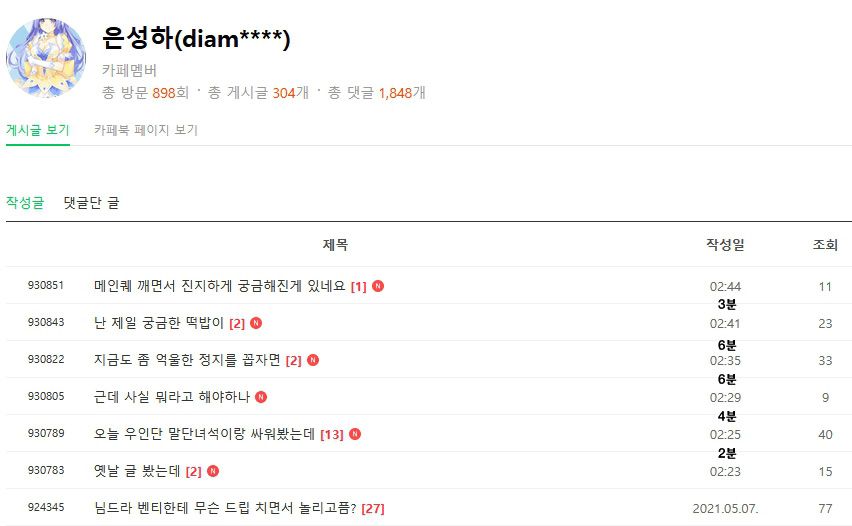 | ±Û ¾²´Â ½Ã°£ °£°Ý º¸¸é Àú·¯ÇÔ. 24ºÐ°£ ±ÛÀ» 6°³¸¦ ÀÛ¼º. Æò±Õ ¾à 4ºÐ °£°Ý. ¸Ó¸®¼Ó¿¡¼ ±ÛÀ» »ý°¢ÇÏ°í ¹ñ´Â°ÍÀÎÁö. ¾Æ´Ï¸é ±×³É µÇ´Â´ë·Î ¸· 1~2 ÁÙ ¹ñ¾î³»´Â °ÍÀÎÁö. |