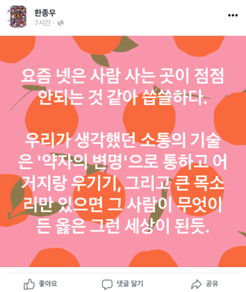 ¿äÁò ³ÝÀº »ç¶÷ »ç´Â °÷ÀÌ Á¡Á¡ ¾ÈµÇ´Â °Í °°¾Æ ¾¹¾µÇÏ´Ù. ¿ì¸®°¡ »ý°¢Çß´ø ¼ÒÅëÀÇ ±â¼úÀº '¾àÀÚÀÇ º¯¸í'À¸·Î ÅëÇÏ°í ¾î°ÅÁö¶û ¿ì±â±â, ±×¸®°í Å« ¸ñ¼Ò¸®¸¸ ÀÖÀ¸¸é ±× »ç¶÷ÀÌ ¹«¾ùÀÌµç ¿ÇÀº ±×·± ¼¼»óÀÌ µÈ µí.